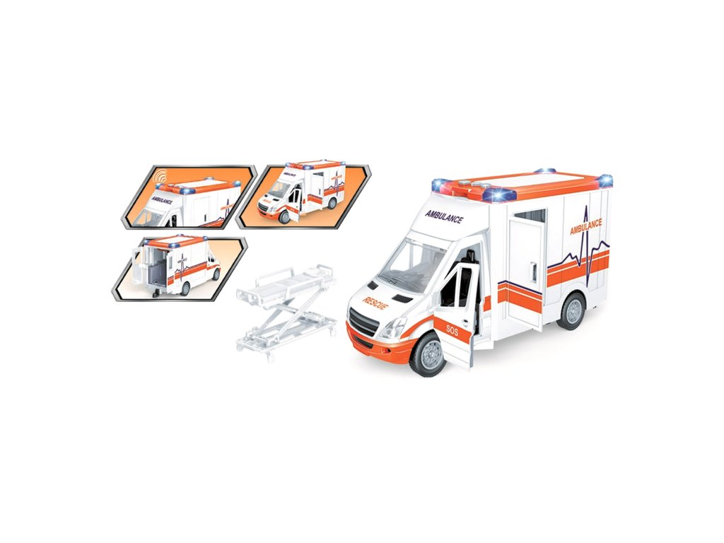 Interaktivní sanitka s nosítky je detailně propracovaný model s pohonem na setrvačník, který dětem umožní zažít realistickou záchranou akci. Je vybavena světelnými a zvukovými efekty a má pět otevíracích dveří, včetně bočních, zadních i kabiny řidiče. Auto je napájeno bateriemi 2x 1.5V AA (jsou součástí balení). Vhodné pro děti od 3 let.Doplňkové parametry