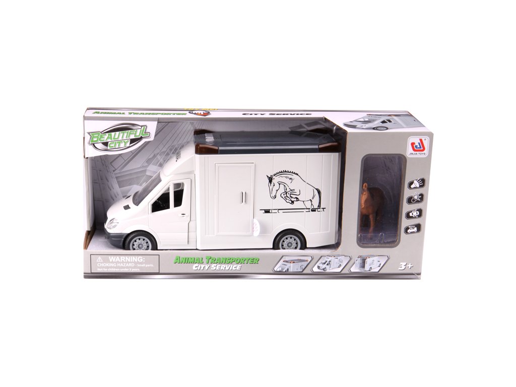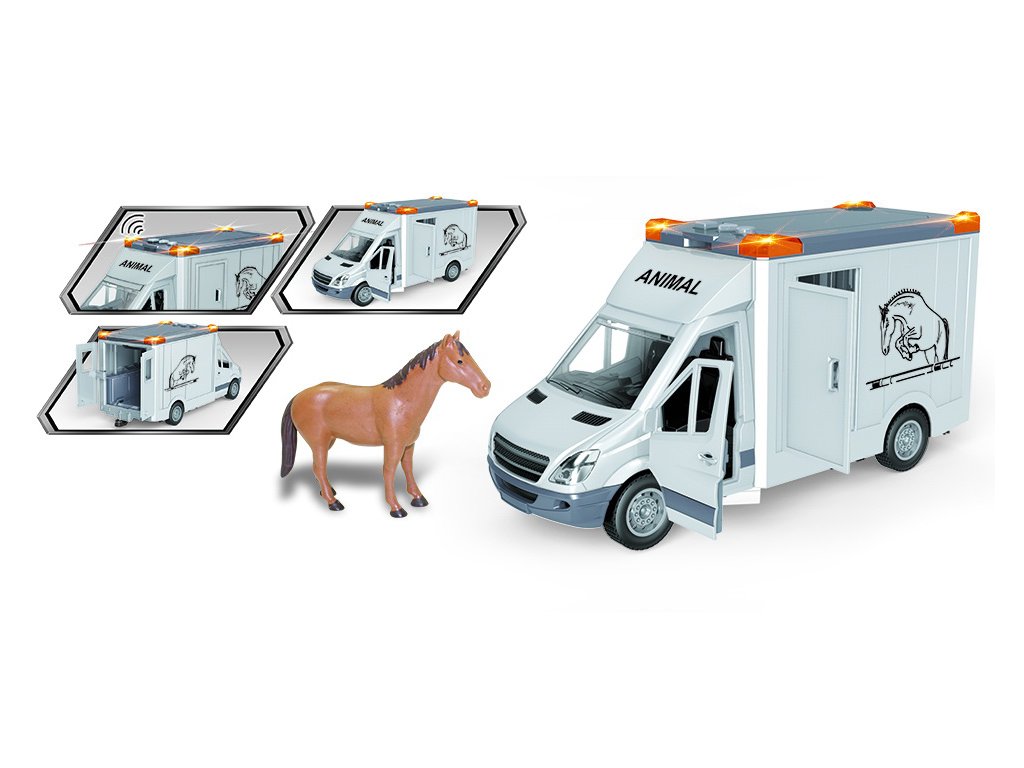 Vydejte se na vzrušující cestu s tímto elegantním a robustním přepravníkem koní. Toto vozidlo, poháněné na setrvačník, bezpečně dopraví zvířecí pasažéry na jakékoli místo. Realistické detaily, zvukové a světelné efekty a pět otevíratelných dveří promění každou hru v nezapomenutelné dobrodružství. Auto je napájeno bateriemi 2x 1.5V AA (jsou součástí balení). Vhodné pro děti od 3 let.Doplňkové parametry