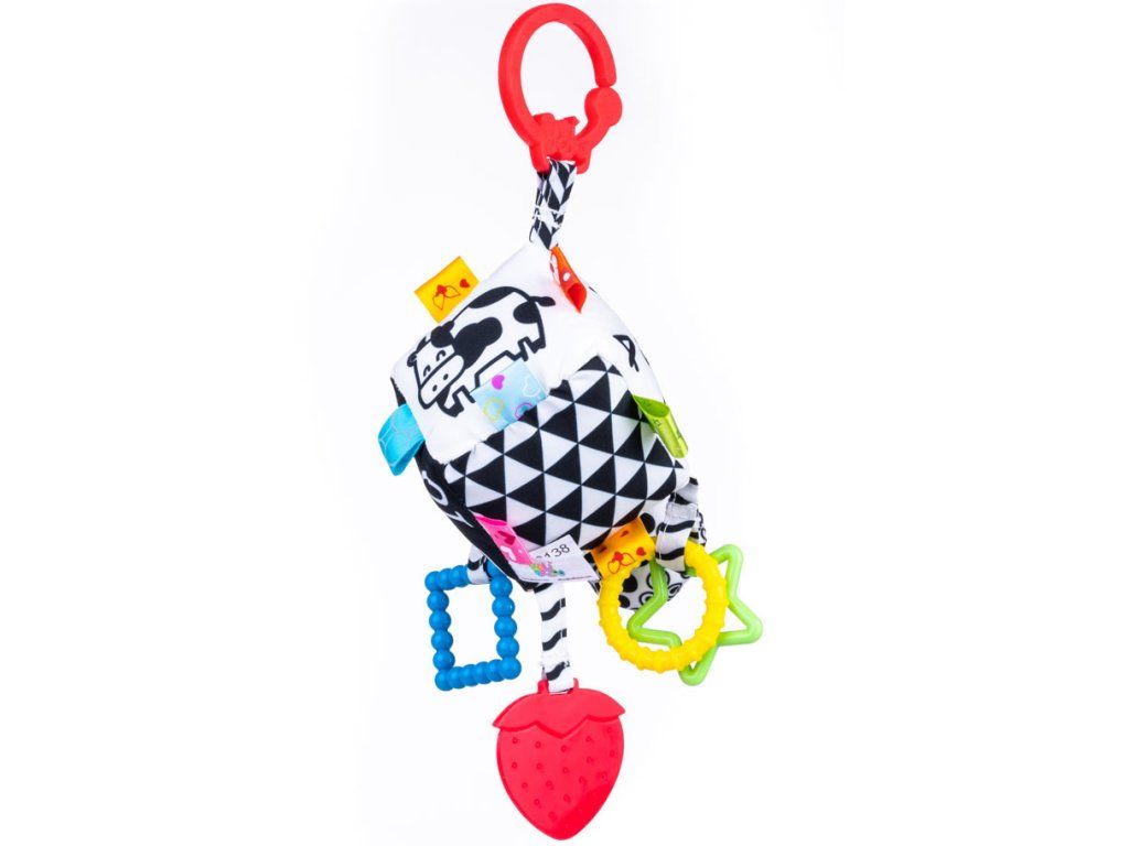 Každá z plyšových hraček umí skvěle počítat a senzorický přívěsek ve tvaru kostky jim v tom pomáhá. Kromě čísel je také zdoben obrázky zvířat a dalšími kontrastními vzory, stejně jako barevnými visačkami s různými texturami. Připevněná kousátka uleví bolavým dásním miminka, kterému se prořezávají zoubky. Díky praktické sponě můžete přívěsek snadno připevnit kamkoli. Tato hračka je vhodná pro děti od narození. Vlastnosti: - praktický přívěsek - visačky s různými texturami - kontrastní vzory - barevná kousátka - věk: 0+